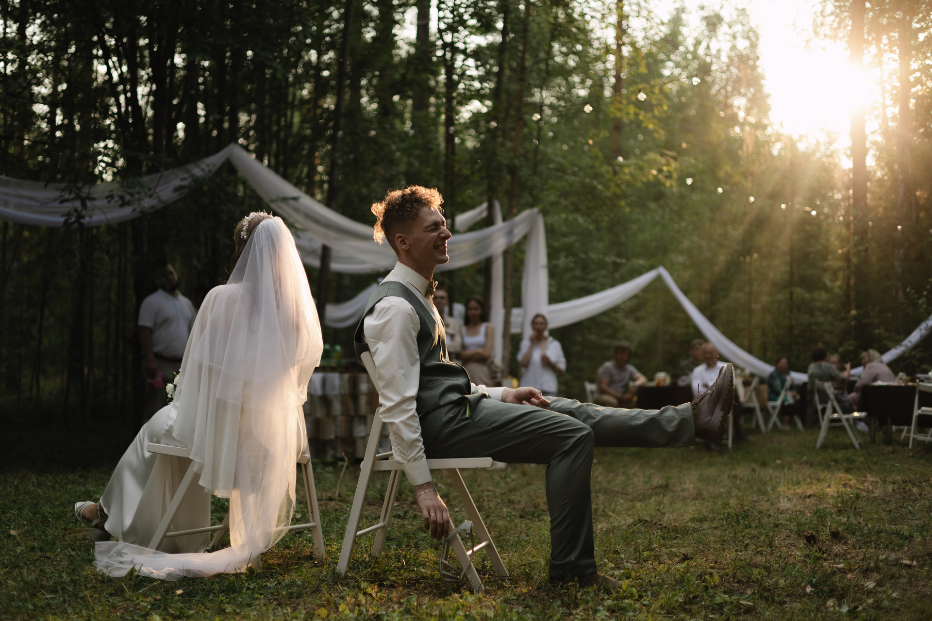 Свадьба развернулась под открытым небом, в живописном сосновом бору, рядом с домиком молодоженов, который сами и строили. К счастью, грозы и тучи обошли нас стороной, потрепав немного нервы невесте.
