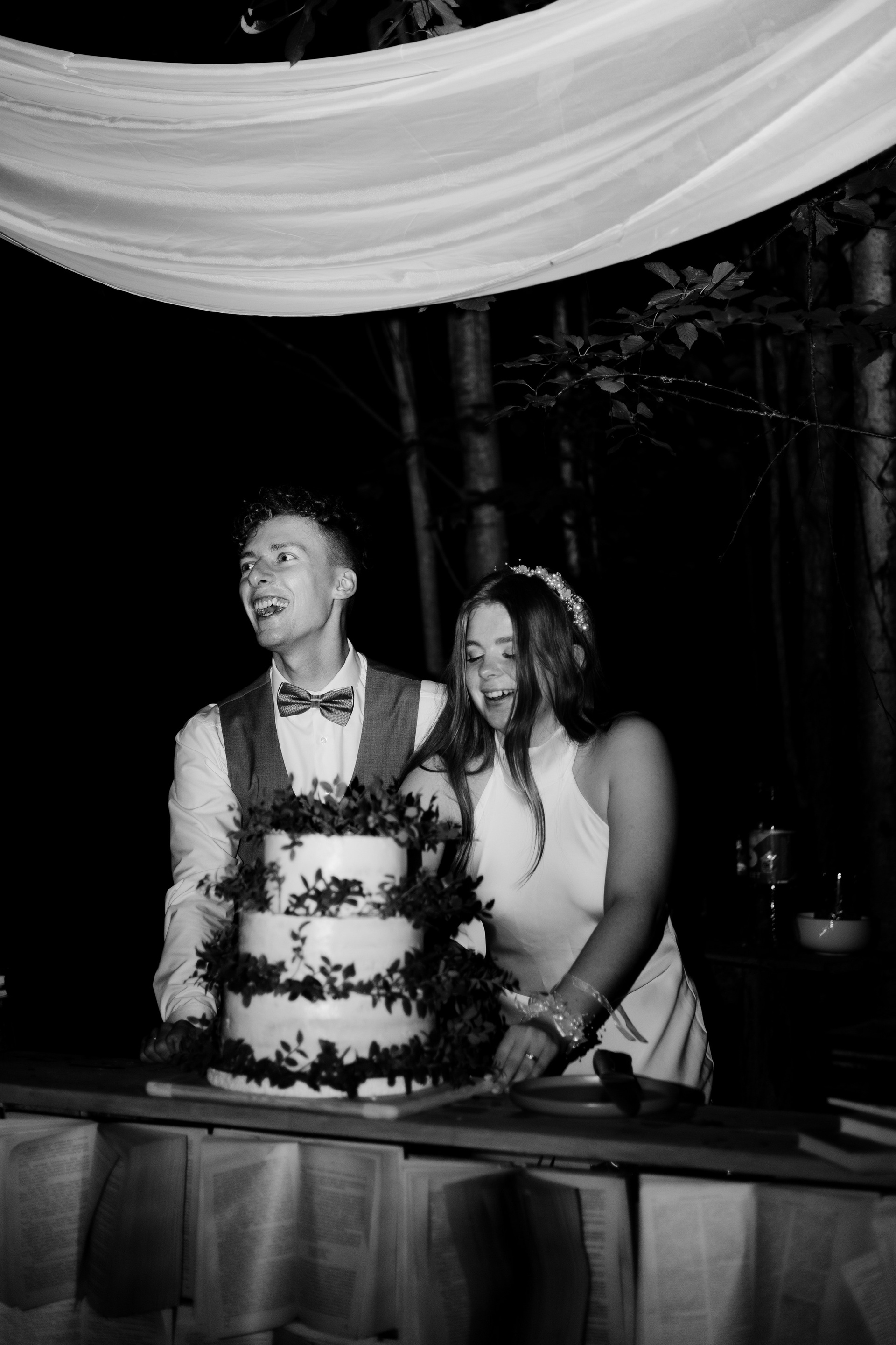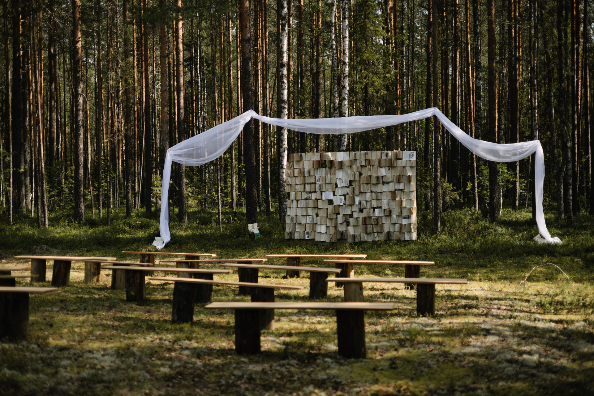 Концепция свадьбы была вдохновлена книгами. Каждая деталь была продумана: книги были разложены по всему лесу, а гостей встречал и направлял библиотекарь. Путь к площадке лежал по лесной тропе, где в семи главах была рассказана история знакомства молодоженов — это был еще и трогательный подарок жениху.